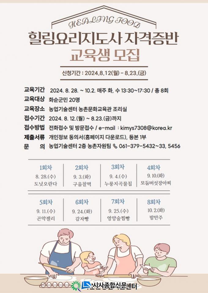½Åû ´ë»óÀº ȼø±º¿¡ ÁÖ¼ÒÁö¸¦ µÎ°í ÀÖÀ¸¸ç, Èú¸µ¿ä¸®¿Í ÀÚ°ÝÁõ Ãëµæ¿¡ °ü½ÉÀÌ ÀÖ´Â ±º¹ÎÀ¸·Î ¼±Âø¼ø 20¸íÀÌ´Ù. ÀÚ¼¼ÇÑ »çÇ×Àº ³ó¾÷±â¼ú¼¾ÅÍ È¨ÆäÀÌÁö¿¡¼ È®ÀÎÇÒ ¼ö ÀÖÀ¸¸ç ½Åû ¹æ¹ýÀº ¿À´Â 12ÀϺÎÅÍ È¼ø±º³ó¾÷±â¼ú¼¾ÅÍ ³óÃÌÀÚ¿øÆÀ(061-379-5433)À¸·Î ÀüÈ ½ÅûÇÏ¸é µÈ´Ù.