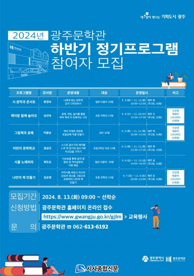ÀÏ¹Ý ½Ã¹ÎÀ» ´ë»óÀ¸·Î ¡ã½Ã âÀÛ°ú ÄܼƮ ¡ã±×¸²Ã¥°ú °ø¿¹ ¡ã½Ã¸¦ ³ë·¡Ç϶ó 3°³ °Á¸¦ ¿î¿µÇÑ´Ù. ¡®½Ã âÀÛ°ú ÄܼƮ¡¯´Â ½Ã¸¦ ÁÁ¾ÆÇÏ´Â ¼ºÀÎÀ» ´ë»óÀ¸·Î ³ªÀÇ »î¿¡ ´ëÇÑ ½Ã¸¦ âÀÛÇÏ°í ¹ßÇ¥ÇÏ´Â ¼ö¾÷À» ÁøÇàÇÑ´Ù. ¡®±×¸²Ã¥°ú °ø¿¹¡¯´Â ¹®ÇÐ ÀÛǰÀ» °¨»óÇÏ°í µ¶ÈÄ È°µ¿À¸·Î °ü·Ã °ø¿¹ ÀÛǰÀ» ¸¸µç´Ù. ¶Ç ¡®½Ã¸¦ ³ë·¡Ç϶󡯴 ½Ã¸¦ ³¶¼ÛÇϱâ À§ÇÑ È£Èí¹ý°ú ¹«´ë ¸Å³Ê¸¦ ¹è¿ì°í ½ÇÁ¦ ¹ßǥȸ¸¦ ÁøÇàÇÑ´Ù.