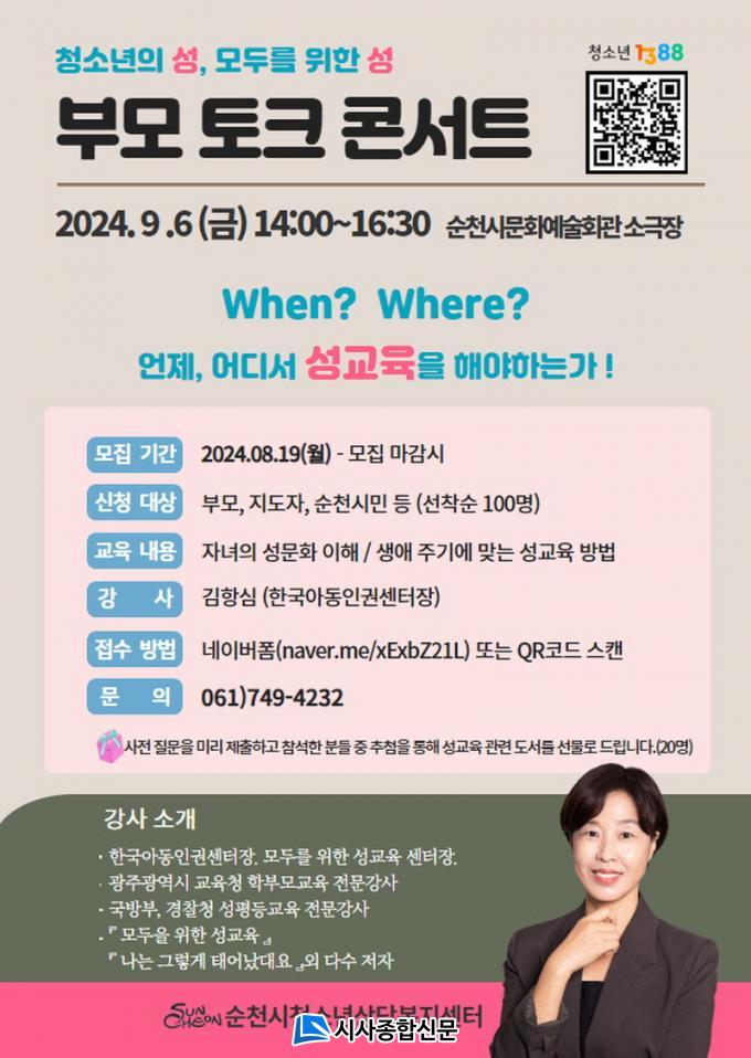 Âü°¡ ½ÅûÀº ºÎ¸ð, ÁöµµÀÚ µî ¼øÃµ½Ã¹ÎÀÌ¸é ´©±¸³ª ¹«·á·Î °¡´ÉÇϸç, 19ÀϺÎÅÍ ³×À̹öÆû(https://naver.me/xExbZ21L) ¶Ç´Â QRÄÚµå ½ºÄµÀ» ÅëÇØ Á¢¼ö°¡ °¡´ÉÇÏ´Ù. º¸´Ù ÀÚ¼¼ÇÑ ³»¿ëÀº ¼¾ÅÍ ´©¸®Áý(sc1388dream.or.kr)¿¡¼ È®ÀÎÇϰųª, ÀüÈ·Î ¹®ÀÇ(061-749-4232) ÇÏ¸é µÈ´Ù.
