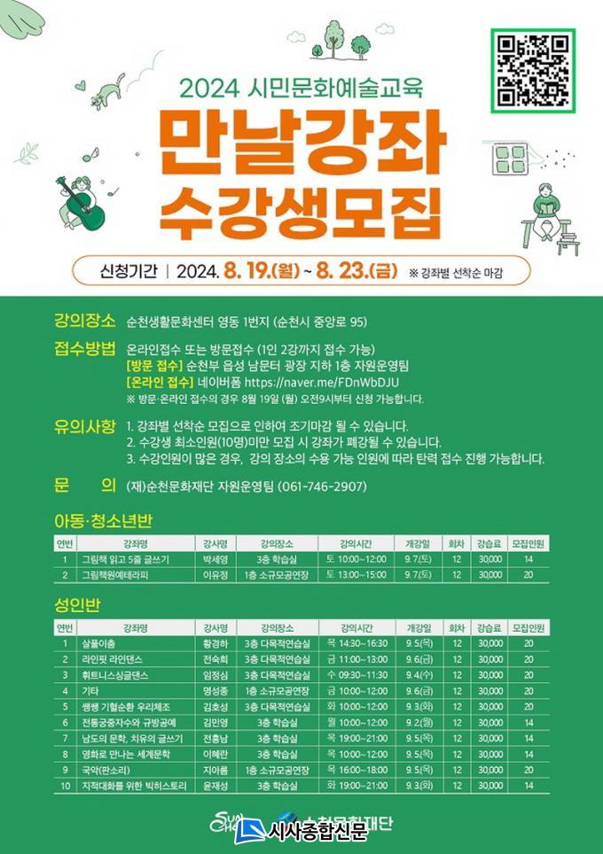 | (Àç)¼øÃµ¹®ÈÀç´Ü, 2024 ½Ã¹Î¹®È¿¹¼ú±³À° ¸¸³¯°Á ÇϹݱ⠼ö°»ý ¸ðÁý 19ÀϺÎÅÍ 23ÀϱîÁö ÃÑ 12°³ °Á ¼ö°»ý ¸ðÁý |