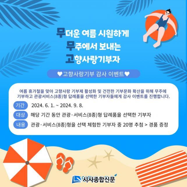 ¹«ÁÖ±ºÃ» °íÇâ»ç¶ûÆÀ À¯¿µÁÖ ÆÀÀåÀº ¡°À̹ø À̺¥Æ®°¡ ¹«ÁÖ¿¡ ±âºÎÇØ ÁֽŠ°í¸¶¿î ºÐµéÀÇ ´õÀ§¸¦ ½ÄÇôÁÖ´Â ±ô¦ ¼±¹°ÀÌÀÚ °ü±¤ ¹«ÁÖ¸¦ ¾Ë¸®´Â Ưº°ÇÑ °è±âµµ µÇ±æ ¹Ù¶õ´Ù¡±¶ó¸ç ¡°À̺¥Æ® È«º¸¿¡ ÃÖ¼±À» ´ÙÇÏ´Â ÇÑÆí, °íÇâ»ç¶û ±âºÎ¸¦ Èñ¸ÁÇÏ´Â ºÐµéÀÇ ¸¶À½À» »ç·ÎÀâ°í Áö¿ª°æÁ¦µµ ¾Æ¿ï·¯ »ì¸± ¼ö ÀÖ´Â ¸Å·ÂÀûÀÎ ´ä·Êǰ ¹ß±¼¿¡ Áö¼ÓÀûÀÎ ³ë·ÂÀ» ±â¿ïÀÏ °Í¡±À̶ó°í ¹àÇû´Ù.