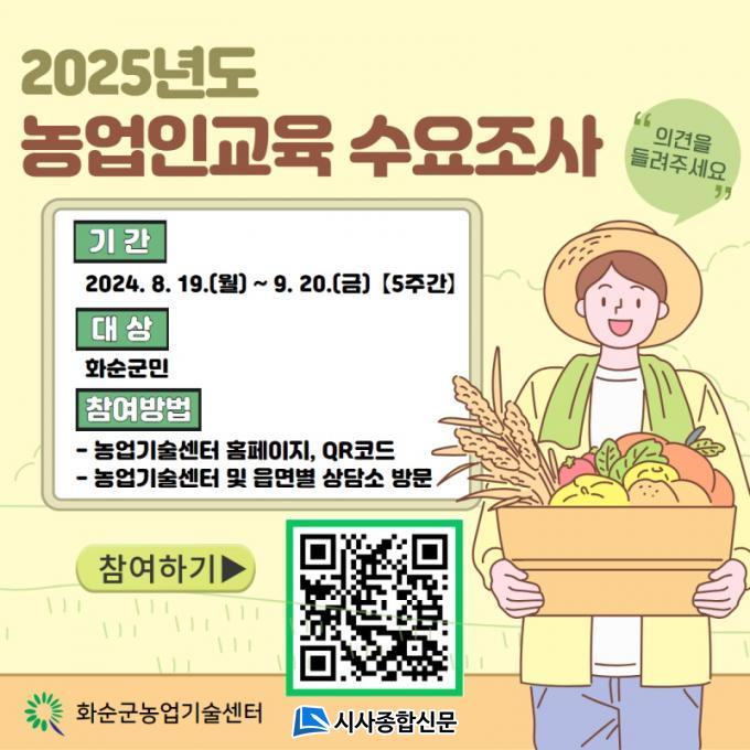 À̹ø ¼ö¿äÁ¶»ç´Â ¿Â¶óÀÎ ¹× ¹æ¹®À» ÅëÇØ Âü¿©ÇÒ ¼ö ÀÖÀ¸¸ç, ¿Â¶óÀÎÀº ³ó¾÷±â¼ú¼¾ÅÍ ´©¸®Áý(³ó¾÷±â¼ú¼¾ÅÍ (hwasun.go.kr))°ú È«º¸ Çö¼ö¸·¿¡ Ç¥±âµÈ QRÄڵ带 ÅëÇØ °¡´ÉÇϰí, ³ó¾÷±â¼ú¼¾ÅÍ ¹× À¾¡¤¸é ³ó¾÷Àλó´ã¼Ò¸¦ ¹æ¹®¡¤Âü¿©ÇÒ ¼ö ÀÖ´Ù.
