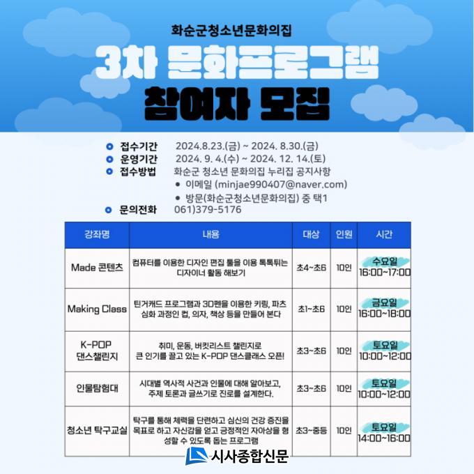 û¼Ò³â¹®ÈÀÇÁýÀ» ÀÌ¿ëÇϴ û¼Ò³â°ú ¿î¿µÀ§¿øÈ¸ÀÇ ÀǰßÀ» ¹Ý¿µÇØ Ã»¼Ò³âÀÌ Èñ¸ÁÇÏ´Â ³»¿ëÀ¸·Î ¡ãMade ÄÜÅÙÃ÷ ¡ãMaking Class ¡ãK-POP´í½º 縰Áö ¡ãÀι°Å½Çè´ë ¡ãû¼Ò³â ʱ¸±³½Ç µî 5°³ ÇÁ·Î±×·¥À¸·Î ±¸¼ºÇÏ¿© 9¿ù 4ÀϺÎÅÍ 12¿ù 14ÀϱîÁö ¸ÅÁÖ ÇØ´ç ¿äÀÏ¿¡ ¿î¿µÇÒ °èȹÀÌ´Ù.