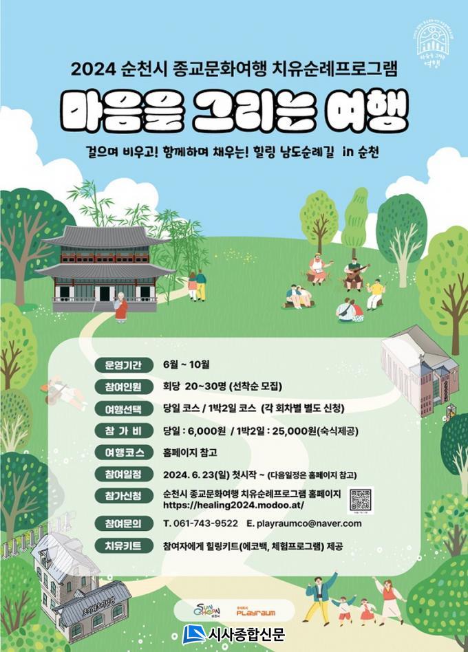 [½Ã»çÁ¾ÇսŹ® = Àå¹Î±Ô ±âÀÚ] ¼øÃµ½Ã(½ÃÀå ³ë°ü±Ô)°¡ ¼øÃµ Á¾±³¹®È¿©Çà Ä¡À¯¼ø·ÊÇÁ·Î±×·¥ Âü°¡ÀÚ¸¦ ¸ðÁýÇÑ´Ù. °ÉÀ¸¸ç ºñ¿ì°í, ÇÔ²²Çϸç ä¿ì´Â ¡°¸¶À½À» ±×¸®´Â ¿©ÇࡱÀ̶ó´Â ÁÖÁ¦·Î ´çÀÏÇü(»çÂûüÇè), ¼÷¹ÚÇü(ÅÛÇýºÅ×ÀÌ, µå·ÎÀ×üÇè µî), ´ëÁß°ø°³Çü(4ÀÎ4»ö ÅäÅ©ÄܼƮ, ³²µµ»çÂûÀ½½Ä°¿¬È¸ µî)ÀÌ ÁøÇàµÈ´Ù.