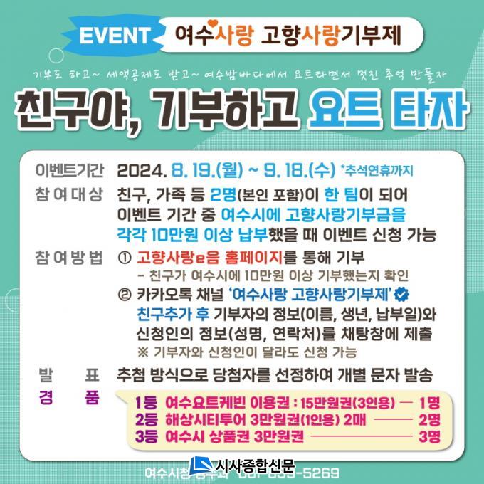 Âü¿© ¹æ¹ýÀº ¡®¿©¼ö»ç¶û °íÇâ»ç¶û±âºÎÁ¦¡¯ īī¿ÀÅå ä³Î¿¡¼ Ä£±¸ Ãß°¡ÇÑ ÈÄ ´ëÈâ¿¡¼ ½ÅûÀΰú ±âºÎÀÚ Á¤º¸¸¦ Á¦ÃâÇÏ¸é µÈ´Ù. ½Ã´Â 9¿ù 20ÀÏ Ãß÷À» ÅëÇØ ´ç÷ °á°ú¸¦ ½Ãû ´©¸®Áý¿¡ °øÁöÇϰí, ´ç÷ÀÚ¿¡°Ô °³º° ¿¬¶ôÇÒ ¿¹Á¤ÀÌ´Ù.