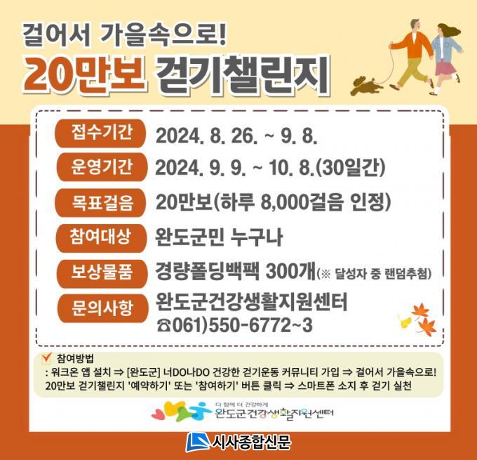 縰Áö´Â 9¿ù 9ÀϺÎÅÍ 10¿ù 8ÀϱîÁö 30Àϰ£ ÁøÇàµÇ¸ç, ±â°£ ³» 20¸¸ º¸ °È±â(ÇÏ·ç 8,000º¸ ÀÎÁ¤)¸¦ ´Þ¼ºÇÏ¸é µÈ´Ù. 20¸¸ º¸ ´Þ¼ºÀÚ Áß Ãß÷À» ÅëÇØ 300¸í¿¡°Ô º¸»ó ¹°Ç°(°æ·® Æúµù ¹é ÆÑ)À» Áö±ÞÇÑ´Ù.