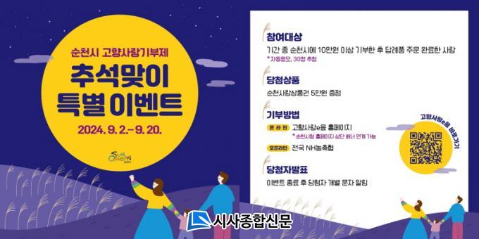 | ¼øÃµ½Ã, Ãß¼®¸ÂÀÌ °íÇâ»ç¶û±âºÎÁ¦ Ưº° À̺¥Æ® ÁøÇà 2024. 9. 2. ~ 9. 20. ¼øÃµ½Ã¿¡ 10¸¸¿ø ÀÌ»ó ±âºÎ ½Ã Ãß°¡ °æÇ° Ãß÷ Á¦°ø |