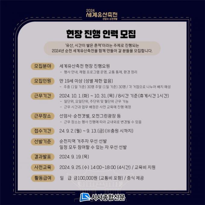 | ¼øÃµ½Ã, 2024 ¼¼°èÀ¯»êÃàÀü-¼±¾Ï»ç-¼øÃµ°¹¹ú ÇÔ²² ±×·Á³¾ ÁøÇàÀη ¸ðÁý 3ÀϱîÁö ¼øÃµ ¼¼°èÀ¯»êÃàÀü ȨÆäÀÌÁö Á¢¼ö |