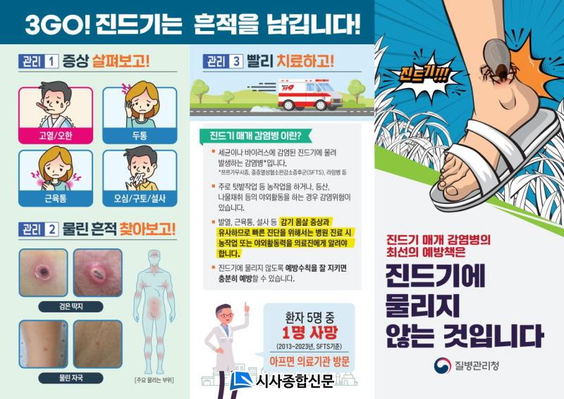 SFTS´Â SFTS ¹ÙÀÌ·¯½º¸¦ º¸À¯ÇÑ ÂüÁøµå±â¿¡ ¹°·Á °¨¿°µÇ¸ç, 415ÀÏÀÇ Àẹ±â¸¦ °ÅÄ£ ÈÄ °í¿(3840¡É)ÀÌ 3~10Àϰ£ Áö¼ÓµÈ´Ù. °¨¿° ÈÄ¿¡´Â ¼Òȱâ Áõ»ó(¿À½É, ±¸Åä, ¼³»ç µî)°ú ÇÔ²² Ç÷¼ÒÆÇ ¹× ¹éÇ÷±¸ °¨¼Ò Áõ»óÀÌ µ¿¹ÝµÇ¸ç, ½ÉÇÑ °æ¿ì »ç¸Á¿¡ À̸¦ ¼ö ÀÖ´Ù. µû¶ó¼ ¾ß¿ÜȰµ¿ ÈÄ 2ÁÖ À̳»¿¡ ÀÌ·¯ÇÑ Áõ»óÀÌ ³ªÅ¸³¯ °æ¿ì Áï½Ã ÀÇ·á±â°üÀ» ¹æ¹®ÇØ ¾ß¿ÜȰµ¿ ÀÌ·ÂÀ» ¹àÈ÷°í Áø·á¸¦ ¹Þ¾Æ¾ß ÇÑ´Ù.