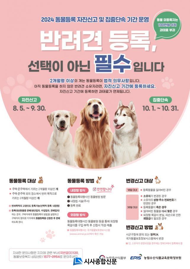 µî·Ï ´ë»óÀº ¹Ý·Á ¸ñÀûÀ¸·Î ±â¸£´Â 2°³¿ù·É ÀÌ»óÀÇ °³·Î µ¿¹°µî·Ï ½ÅûÀº °ÅÁÖÁö¿Í °ü°è¾øÀÌ °ü³» µ¿¹°µî·Ï ´ëÇà ±â°ü(µ¿¹°º´¿ø)¿¡¼ µî·ÏÇÒ ¼ö ÀÖ´Ù. µ¿¹°µî·ÏÀº ¹«¼±½Äº° ÀåÄ¡¸¦ ü³»¿¡ »ðÀÔÇÏ´Â ³»ÀåÇü ¹æ½Ä°ú ¸ñ°ÉÀÌ µîÀÇ ÇüÅ·Πü¿Ü¿¡ ºÎÂøÇÏ´Â ¿ÜÀåÇü ¹æ½Ä Áß ¼±ÅÃÇÒ ¼ö ÀÖ´Ù. ¶ÇÇÑ °í¾çÀÌÀÇ °æ¿ì ¼±Åà »çÇ×ÀÌ¸ç µ¿¹°µî·Ï´ëÇà»çÀÎ µ¿¹°º´¿ø¿¡¼ ³»ÀåÇüÀ¸·Î µ¿¹°µî·ÏÀÌ °¡´ÉÇÏ´Ù.