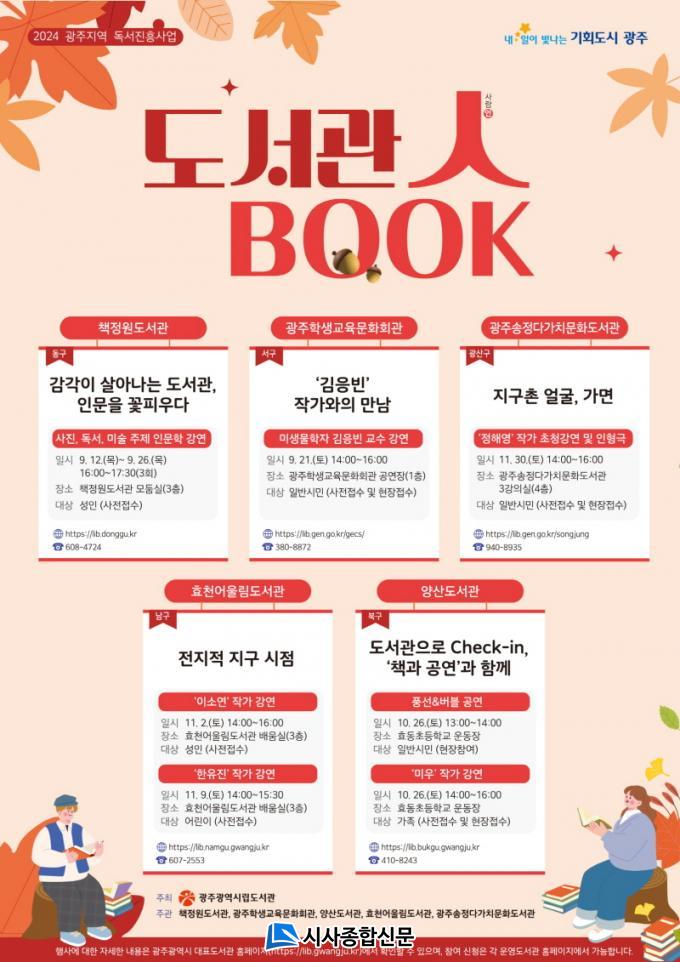 ±¤ÁÖ±¤¿ª½Ã¸³µµ¼°üÀº ¿ÃÇØ ÇϹݱ⠽ùΠµ¶¼ÁøÈï»ç¾÷À¸·Î ¿À´Â 12ÀϺÎÅÍ 11¿ù30ÀϱîÁö Ã¥Á¤¿øµµ¼°ü, ±¤ÁÖÇлý±³À°¹®Èȸ°ü, ¾ç»êµµ¼°ü, ȿõ¾î¿ï¸²µµ¼°ü, ±¤ÁÖ¼ÛÁ¤´Ù°¡Ä¡¹®Èµµ¼°ü¿¡¼ ¡®µµ¼°ü‧ìÑ‧book¡¯ Çà»ç¸¦ ¿¬´Ù.