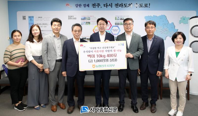 [½Ã»çÁ¾ÇսŹ® = ¿À½ÂÅà ±âÀÚ] NH³óÇù ÀüÁÖ½ÃÁöºÎ(ÁöºÎÀå ÇϾçÁø)´Â 9ÀÏ ÀüÁֽø¦ ¹æ¹®ÇØ ¾î·Á¿î ÀÌ¿ôµéÀÌ Ç³¿ä·Ó°í ³Ë³ËÇÑ Ãß¼® ¸íÀýÀ» º¸³¾ ¼ö ÀÖµµ·Ï 1000¸¸ ¿ø »ó´çÀÇ »ç¶ûÀÇ ½Ò(10kg) 400Æ÷¸¦ Àü´ÞÇß´Ù.