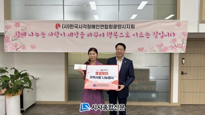| ¿©¼ö±¤¾çÇ׸¸°ø»ç, Ãß¼®¸ÂÀÌ ¼º±Ý Àü´Þ·Î Áö¿ª»çȸ¿¡ µû¶æÇÑ ¿Â±â ÀüÇØ Ãß¼® ¸íÀýÀ» ¸Â¾Æ Áö¿ª »çȸº¹Áö½Ã¼³ 40°³¼Ò¿¡ ¿Â´©¸®»óǰ±Ç Àü´Þ |
