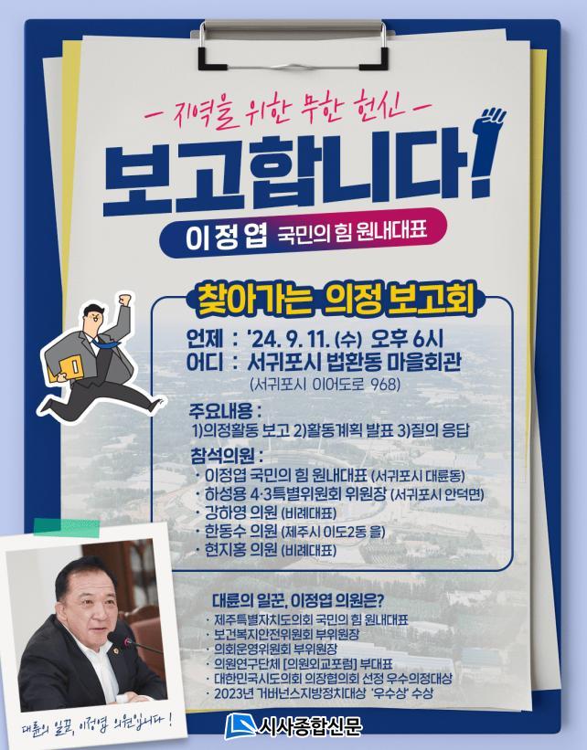 À̳¯ ÀÇÁ¤ º¸°íȸ´Â ÀÇÁ¤È°µ¿ º¸°í, Ȱµ¿ °èȹ ¹ßÇ¥, ÁúÀÇ ÀÀ´ä µîÀ¸·Î ÁøÇàµÇ¸ç, Á¦ÁÖÆ¯º°ÀÚÄ¡µµÀÇȸ Çϼº¿ë 4¡¤3 Ưº°À§¿øÈ¸ À§¿øÀå(¼±ÍÆ÷½Ã ¾È´ö¸é), °ÇÏ¿µ ÀÇ¿ø(ºñ·Ê´ëÇ¥), Çѵ¿¼ö ÀÇ¿ø(Á¦Áֽà À̵µ2µ¿ À»), ÇöÁöÈ« ÀÇ¿ø(ºñ·Ê´ëÇ¥)ÀÌ ÀÚ¸®¸¦ ÇÔ²² ÇÑ´Ù.
