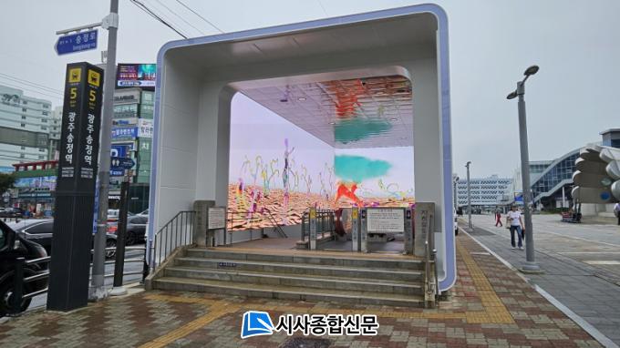 ±¤ÁÖ¼ÛÁ¤¿ª ¡®ºûÀÇ °ü¹®¡¯Àº ±¤ÁÖÀÇ Ã¹ °ü¹®ÀÎ ¼ÛÁ¤¿ª ¾Õ ÁöÇÏö 5¹ø Ãⱸ º®¸é¿¡ ´ëÇü LED½ºÅ©¸°À» ¼³Ä¡ÇØ ±¤ÁÖ¸¦ ¹æ¹®ÇÏ´Â ¿ÜÁöÀε鿡°Ô ´Ù¾çÇÑ ÀÛ°¡ÀÇ ÀÛǰ µîÀ» ¹Ìµð¾î¾ÆÆ®¸¦ ÅëÇØ Á¦°øÇÑ´Ù. Ãⱸ ¿· µµ·ÎÂÊÀº ±³Åë¿¡ ¹æÇصÇÁö ¾Êµµ·Ï ´Ù¾çÇÑ »ö±òÀÇ ÄÜÅÙÃ÷¸¦ Á¦ÇÑÇÏ°í ±¤ÁÖÀÇ ±Û±Í, ±¤Áֽà ·Î°í¸¦ Çü»óÈÇÑ À̹ÌÁö µîÀ» äµµ°¡ ³·Àº ´Ü»öÀ¸·Î °£°áÇÏ°Ô Ç¥ÇöÇß´Ù.