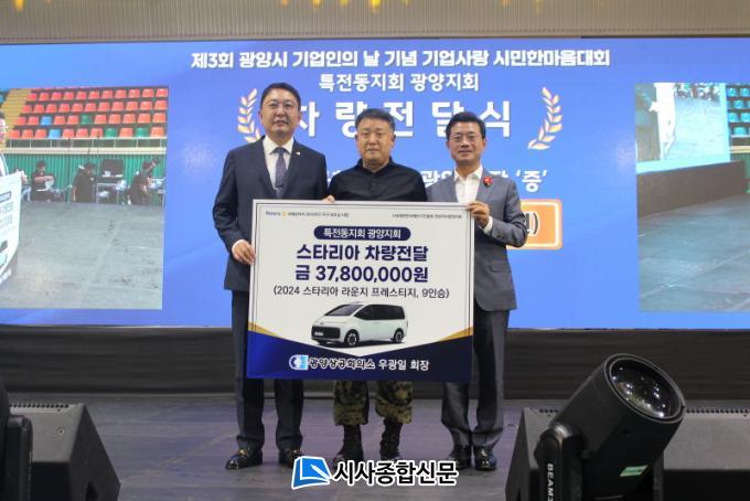 Â÷·®Àü´Þ½ÄÀº ¿ì±¤ÀÏ È¸ÀåÀÌ 3,780¸¸¿øÀ» Ãâ¿¬ÇØ ±¤¾ç½Ã °ü³» À糹߻ý½Ã Áö¿øÂ÷·®À¸·Î ¾²ÀÏ ½ºÅ¸¸®¾Æ Â÷·®À» ƯÀüµ¿Áöȸ¿¡ Àü´ÞÇÏ´Â ¹æ½ÄÀ¸·Î ÁøÇàµÇ¾ú´Ù.