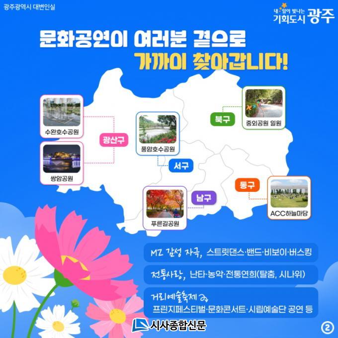 ÀÚ¼¼ÇÑ ÀÏÁ¤Àº ±¤Áֽà ´©¸®Áý(https://www.gwangju.go.kr/)ÀÇ Ä«µå´º½º ¡®Ã£¾Æ°¡´Â ¹®È°ø¿¬ ¿¹¼úäñ(¾Ö) ¹°µç °¡À»¡¯À» ÅëÇØ È®ÀÎÀÌ °¡´ÉÇÏ´Ù. ¶Ç ±¤ÁÖ¿¡¼ ¿¸®´Â °ø¿¬‧Àü½Ã‧ÃàÁ¦ µî ´Ù¾çÇÑ ¹®ÈÇà»ç´Â ±¤ÁÖ¹®È¿¹¼úÅëÇÕ Ç÷§Æû ¡®µð¾î¸¶ÀÌ ±¤ÁÖ¡¯ ´©¸®Áý(https://dmgj.kr/)¿¡¼ È®ÀÎÇÒ ¼ö ÀÖ´Ù.