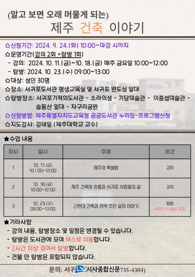 [½Ã»çÁ¾ÇսŹ® = °í¼º¹Î ±âÀÚ] ¼±ÍÆ÷µµ¼°ü(ºÐ°üÀå ±è¸íÈñ)Àº Á¦ÁÖ °ÇÃ๰°ú °ø°£¿¡ ´ëÇÑ °ÀÇ¿Í Å½¹æÀ» ÅëÇØ Áö¿ªÁÖ¹ÎÀÇ Àι®ÇÐÀû ¼Ò¾çÀ» ³ÐÈ÷´Â ±âȸ¸¦ ¸¶·ÃÇϰíÀÚ¡®2024³â (¾Ë°í º¸¸é ¿À·¡ ¸Ó¹°°Ô µÇ´Â) Á¦ÁÖ °ÇÃà À̾߱⡯Âü°¡ÀÚ¸¦ ¸ðÁýÇÑ´Ù.