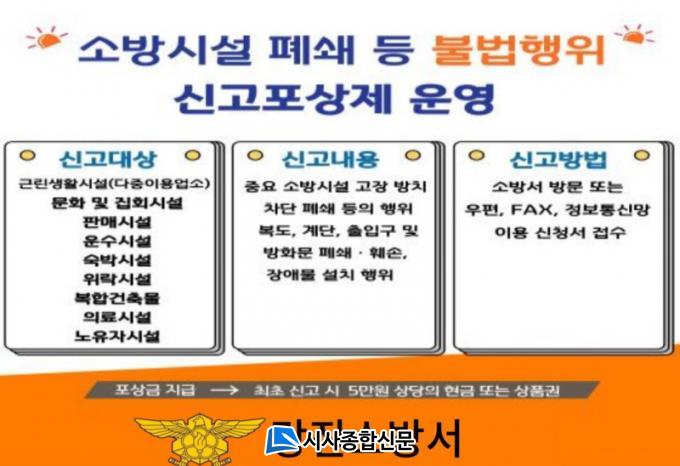 ¼Ò¹æ½Ã¼³ ºÒ¹ýÇàÀ§ ½Å°íÆ÷»óÁ¦´Â ºñ»ó±¸ µî ¼Ò¹æ½Ã¼³¿¡ °¡ÇØÁö´Â ºÒ¹ýÇàÀ§¸¦ ½Å°íÇÏ´Â °æ¿ì Æ÷»ó±ÝÀ» Áö±ÞÇÏ´Â Á¦µµ´Ù. ¼Ò¹æ½Ã¼³¿¡ ´ëÇÑ ½Ã¹ÎÀÇ °æ°¢½É °íÃë¿Í ¾ÈÀüÀÇ½Ä È®»êÀ» ÅëÇØ ÈÀ縦 ¿¹¹æÇϰí ÇÇÇØ¸¦ ÃÖ¼ÒÈÇϰíÀÚ ÃßÁøµÈ Á¦µµ´Ù.