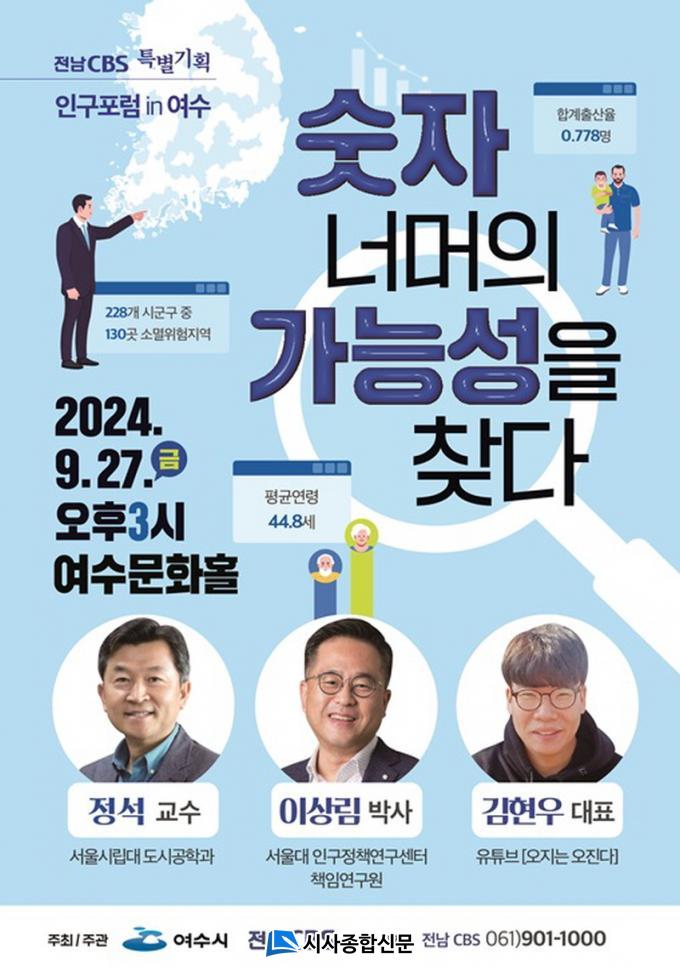 ¿©¼ö½Ã¿Í Àü³²CBS°¡ °øµ¿À¸·Î ÁÖÃÖ¡¤ÁÖ°üÇÏ´Â À̹ø Åä·Ðȸ´Â ¡®¼ýÀÚ ³Ê¸ÓÀÇ °¡´É¼ºÀ» ã´Ù¡¯¸¦ ÁÖÁ¦·Î ¼öµµ±Ç Àα¸ÁýÁß°ú ÀúÃâ»ý¡¤°í·ÉÈ·Î ÀÎÇÑ Áö¹æ¼Ò¸ê ¹× Àα¸¹®Á¦¿¡ ´ëÇÑ ÇØ¹ýÀ» ¸ð»öÇϱâ À§ÇØ ¸¶·ÃµÆ´Ù.