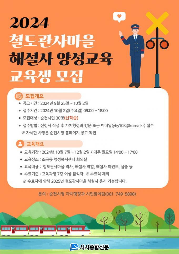 [½Ã»çÁ¾ÇսŹ® = Àå¹Î±Ô ±âÀÚ] ¼øÃµ½Ã(½ÃÀå ³ë°ü±Ô)´Â 9¿ù 25ÀϺÎÅÍ 10¿ù 2ÀϱîÁö 2025³â öµµ°ü»ç¸¶À» ¿¹ºñ ÇØ¼³»çÀÇ ¿ª·® °È¸¦ À§ÇÑ 2024 öµµ°ü»ç¸¶À» ÇØ¼³»ç ¾ç¼º°úÁ¤ ±³À°»ýÀ» ¸ðÁýÇÑ´Ù°í ¹àÇû´Ù.