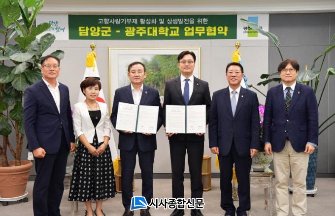À̳¯ Çù¾à½Ä¿¡´Â ±èµ¿Áø ÃÑÀåÀ» ºñ·ÔÇÑ °ü°èÀÚµéÀÌ Âü¼®ÇßÀ¸¸ç, ±¤ÁÖ´ëÇб³´Â ¼Ò¼Ó ±³Á÷¿øÀ» ´ë»óÀ¸·Î °íÇâ»ç¶û±âºÎÁ¦¸¦ È«º¸ÇÏ°í ´ã¾ç±º¿¡¼´Â È«º¸È°µ¿À» Áö¿øÇϰڴٴ ³»¿ëÀÇ Çù¾àÀ» ÁøÇàÇß´Ù.
