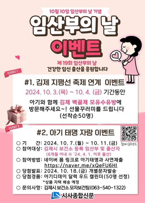 ¡®¿ì¸®¾Æ±â ŸíÀÚ¶ûÇϱ⡯ À̺¥Æ®´Â ½Ãº¸°Ç¼Ò¿¡ ÀÓ»êºÎ µî·ÏÀÌ µÇ¾î ÀÖ´Â ÀÓ»êºÎ¸¦ ´ë»óÀ¸·Î ÁøÇàµÈ´Ù. º¸°Ç¼Ò ȨÆäÀÌÁö(°øÁö»çÇ×)¿¡ °Ô½ÃµÈ À̺¥Æ® ¾È³» Æ÷½ºÅÍÀÇ QRÄÚµå·Î Á¢¼ÓÇØ Âü¿©ÇÏ¸é µÇ°í, Ÿí°ú »ç¿¬À» Á¦ÃâÇØ ÁØ ÀÓ»êºÎ 50¸íÀ» ¼±Á¤ÇØ ¾Æ±â µðµ¥ÀÌ ´Þ·ÂÀ» ÀÚÅÃÀ¸·Î ¹è¼ÛÇÒ ¿¹Á¤ÀÌ´Ù.