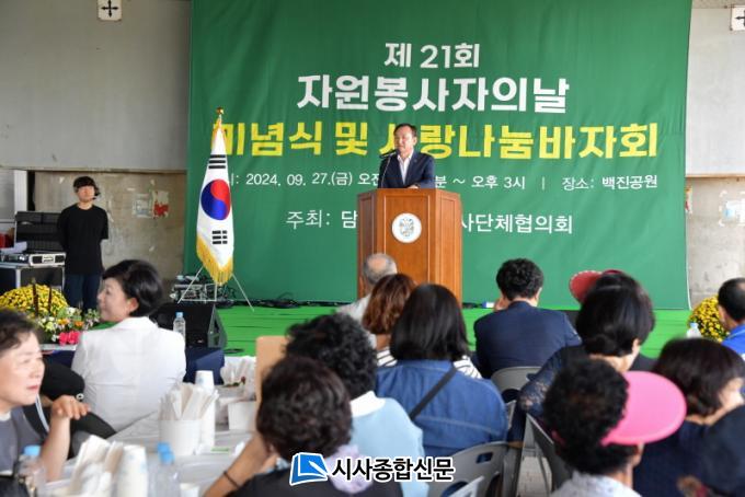 [½Ã»çÁ¾ÇսŹ® = ¿À½ÂÅà ±âÀÚ] ´ã¾ç±º ÀÚ¿øºÀ»çÇùÀÇȸ ÁÖ°üÀ¸·Î 27ÀÏ ¹éÁø°ø¿ø ÀÏ¿ø¿¡¼ ¿¸° ¡®Á¦21ȸ ÀÚ¿øºÀ»çÀÚÀÇ ³¯ ±â³ä½Ä ¹× »ç¶û³ª´® ¹ÙÀÚȸ¡¯°¡ 1,000¿© ¸íÀÇ ÀÚ¿øºÀ»çÀÚ¿Í Áö¿ªÁֹεéÀÌ Âü¿©ÇÑ °¡¿îµ¥ ¼ºÈ²¸®¿¡ ¸¶¹«¸®µÆ´Ù.