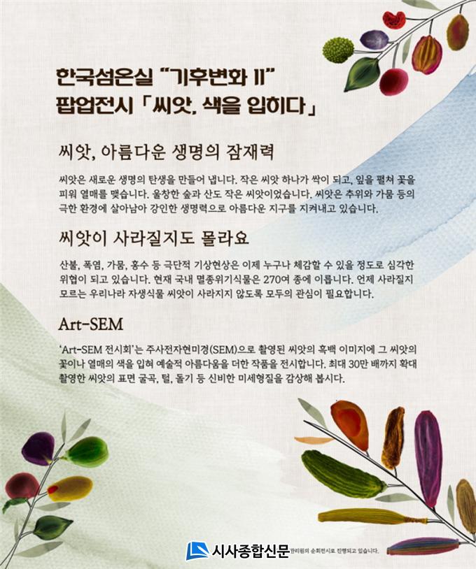 À̹ø ÆË¾÷ Àü½Ã´Â ÁÖ»çÀüÀÚÇö¹Ì°æ(SEM)À» ÀÌ¿ëÇÑ Art-SEM »çÁø Àü½Ãȸ·Î, ¾¾¾ÑÀ» ÃÖ´ë 30¸¸ ¹è±îÁö È®´ë ÃÔ¿µÇÑ À̹ÌÁö¸¦ ¹ÙÅÁÀ¸·Î, ¾¾¾ÑÀÌ ÀÚ¶ó¸é¼ ÇÇ¿ì´Â ²ÉÀ̳ª ¿¸ÅÀÇ »öÀ» ´õÇÏ¿© ¿¹¼úÀûÀÎ ÀÛǰÀ¸·Î Àçź»ý½ÃŲ ÀÛǰµéÀÌ Àü½ÃµÈ´Ù.