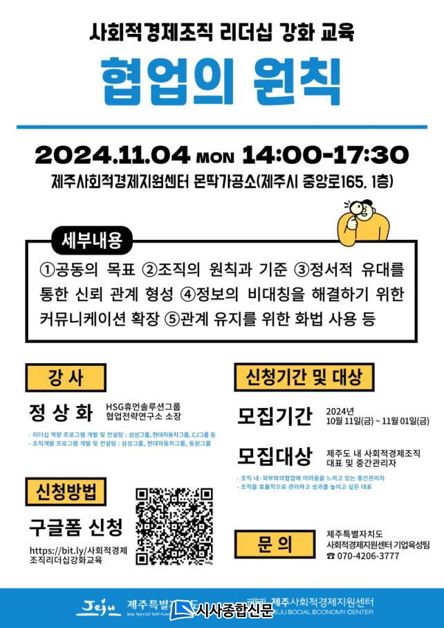 [½Ã»çÁ¾ÇսŹ® = °í¼º¹Î ±âÀÚ] Á¦ÁÖÆ¯º°ÀÚÄ¡µµ»çȸÀû°æÁ¦Áö¿ø¼¾ÅÍ(¼¾ÅÍÀå ÀÓÇöÁ¤)´Â Á¦ÁÖµµ ³» »çȸÀû°æÁ¦Á¶Á÷ ´ëÇ¥ ¹× Áß°£°ü¸®ÀÚ¸¦ ´ë»óÀ¸·Î ÁøÇàÇÏ´Â ¸®´õ½Ê °È ±³À° ¡®Çù¾÷ÀÇ ¿øÄ¢¡¯ Âü¿©ÀÚ¸¦ ¸ðÁýÇÑ´Ù°í ¹àÇû´Ù.