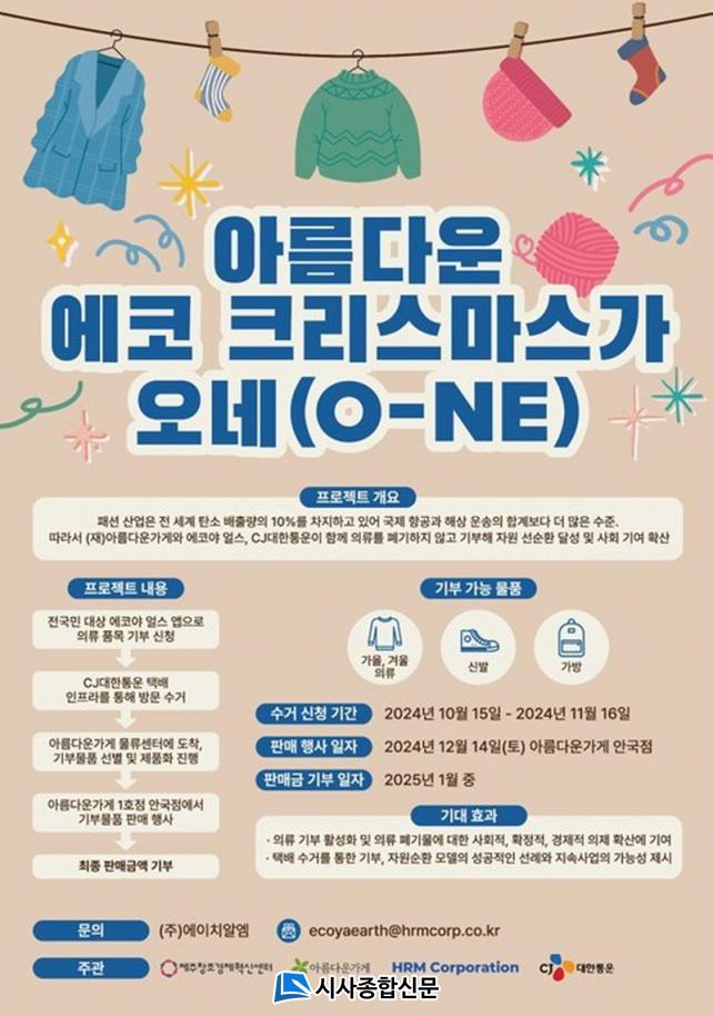 ¡®¾Æ¸§´Ù¿î ¿¡ÄÚ Å©¸®½º¸¶½º°¡ ¿À³×(O-NE)¡¯ ÇÁ·ÎÁ§Æ®´Â Àü ±¹¹ÎÀ» ´ë»óÀ¸·Î 10¿ù 15ÀϺÎÅÍ 11¿ù 16ÀϱîÁö °¡À», °Ü¿ï ÀÇ·ù¿Í ½Å¹ß, °¡¹æ µîÀÇ Ç°¸ñÀ» ±âºÎ¹ÞÀ» ¿¹Á¤ÀÌ´Ù. CJ´ëÇÑÅë¿îÀÌ Àü±¹ Åùè ÀÎÇÁ¶ó¸¦ Ȱ¿ëÇØ ±âºÎ ¹°Ç°À» ¼ö°ÅÇÑ´Ù.