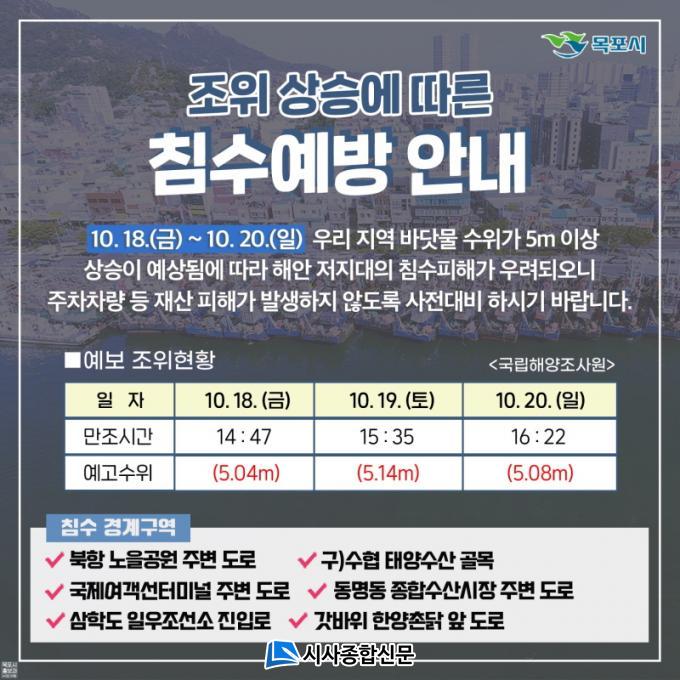 [½Ã»çÁ¾ÇսŹ® = ¿À½ÂÅà ±âÀÚ] ¸ñÆ÷½Ã´Â ´ëÁ¶±âÀÎ ¿À´Â 18ÀϺÎÅÍ 20ÀÏ ¿ÀÈÄ 2½Ã ~ 5½Ã »çÀÌ ¹Ù´å¹° ¼öÀ§°¡ 5.0m ÀÌ»ó (Á¶¼®Ç¥»ó 10/19 ÃÖ°í 5.14m) »ó½Â ¿¹»óµÈ´Ù°í ¹àÇû´Ù. ÀÌ¿¡ µû¶ó ÇÇÇØ¿¹¹æÀ» À§ÇÑ Ã¶ÀúÇÑ ´ëºñ¸¦ ´çºÎÇß´Ù.