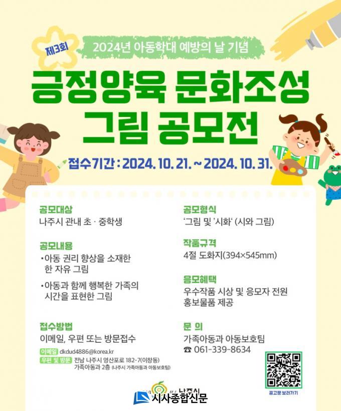 ³ªÁÖ½Ã(½ÃÀå À±º´ÅÂ)´Â ¿À´Â 31ÀϱîÁö ¡®¾Æµ¿ ±Ç¸® Çâ»ó°ú ÇູÇÑ °¡Á·ÀÇ ½Ã°£¡¯À» ÁÖÁ¦·Î °ü³» ÃÊ¡¤ÁßÇлý ´ë»ó ±×¸² °ø¸ðÀü ÀÛǰÀ» Á¢¼öÇÑ´Ù°í 21ÀÏ ¹àÇû´Ù.