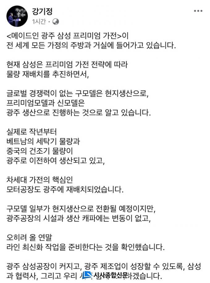 ÇÑÆí, °±âÁ¤ ±¤ÁÖ½ÃÀåÀº À̳¯ »çȸ°ü°è¸Á¼ºñ½º(SNS)ÀÎ ÆäÀ̽ººÏ¿¡ ¡°»ï¼ºÀüÀÚ ±¤ÁÖ»ç¾÷ÀåÀÌ Ä¿Áö°í, ±¤ÁÖ Á¦Á¶¾÷ÀÌ ¼ºÀåÇÒ ¼ö ÀÖµµ·Ï »ï¼ºÀüÀÚ¿Í Çù·Â»ç, ±×¸®°í ±¤Áֽð¡ ÇÔ²² ³ë·ÂÇØ ³ª°¥ °Í¡±À̶ó¸ç ¡°¸ÞÀ̵åÀÎ ±¤ÁÖ »ï¼º ÇÁ¸®¹Ì¾ö °¡ÀüÀÌ ±Û·Î¹ú °æÀï·ÂÀ» °®Ãç Àü ¼¼°è ¸ðµç °¡Á¤ÀÇ ÁÖ¹æ°ú °Å½Ç¿¡ µé¾î°¥ ¼ö ÀÖµµ·Ï Àû±Ø Çù·ÂÇϰڴ١±°í ÀüÇß´Ù.