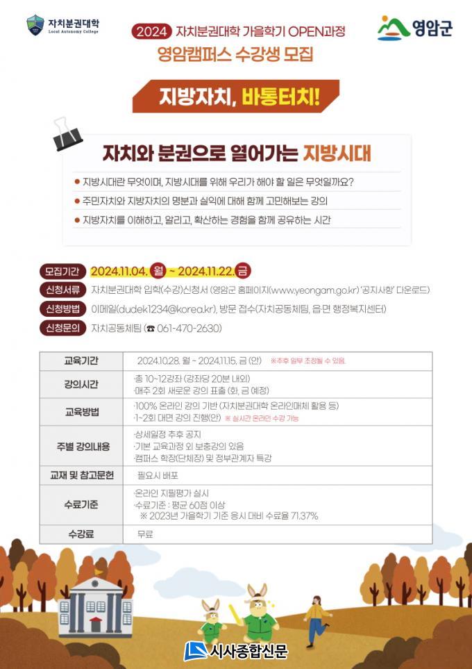 °¡À»Çбâ´Â ÀÌ´Þ 28ÀϺÎÅÍ 11¿ù 15ÀϱîÁö°í, 20ºÐ ³»¿ÜÀÇ ´ë¸é °ÀÇ·Î ±¸¼ºµÅ ÀÖ°í, ¿Â¶óÀÎ ¼ö°µµ ÇÒ ¼ö ÀÖ¾î ´©±¸³ª ºÎ´ã¾øÀÌ µéÀ» ¼ö ÀÖ´Ù. ƯÈ÷, À̹ø Çб⿡´Â ¡®Áö¹æÀçÁ¤ÀÇ ÀÌÇØ¡¯ ¡®¹Ì±¹ Áö¹æÀÚÄ¡ÀÇ ÀÌÇØ¡¯ µî ½Å±Ô °úÁ¤ÀÌ Æ÷ÇԵŠÀÖ´Ù.
