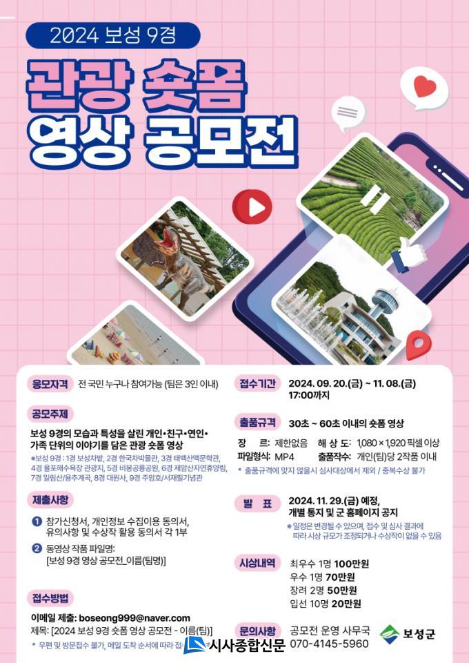¿µ»óÀÇ ±Ô°ÝÀº 30ÃÊ¿¡¼ 1ºÐ ¹Ì¸¸ÀÇ 1,080x1,920Çȼ¿ ÀÌ»óÀÇ mp4 Çü½ÄÀ¸·Î, Âü°¡ÀÚ´ç ÃÖ´ë µÎ ÀÛǰ±îÁö boseong999@naver.comÀ¸·Î Á¦ÃâÇÏ¸é µÇ°í Á¢¼ö ±â°£Àº 11¿ù 8ÀÏ 17½Ã±îÁö´Ù.