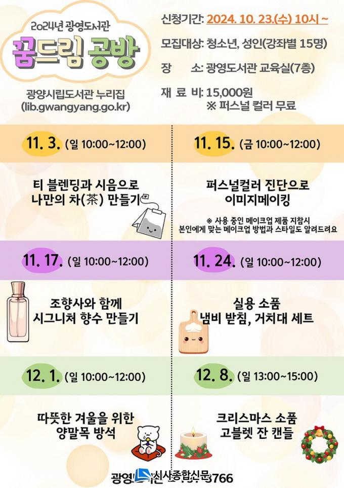 Âü¿© ½ÅûÀº ÇÁ·Î±×·¥º° 15¸í¾¿ ¼±Âø¼øÀ̸ç Áߺ¹ ½ÅûÀÌ °¡´ÉÇÏ´Ù. 10¿ù 23ÀÏ(¼ö) ¿ÀÀü 10½ÃºÎÅÍ µµ¼°ü ´©¸®Áý(http://lib.gwangyang.go.kr)¿¡¼ ½ÅûÇÒ ¼ö ÀÖÀ¸¸ç ÀÚ¼¼ÇÑ »çÇ×Àº ±¤¿µµµ¼°üÆÀ(¢Ï797-3766)À¸·Î ¹®ÀÇÇÏ¸é µÈ´Ù.