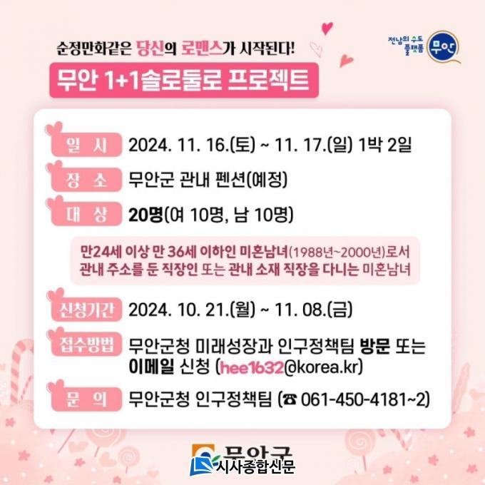 [½Ã»çÁ¾ÇսŹ® = ¿À½ÂÅà ±âÀÚ] ¹«¾È±º(±º¼ö ±è»ê)Àº ¿À´Â 11¿ù 16ÀϺÎÅÍ 17ÀϱîÁö 1¹Ú 2ÀÏ °£ÀÇ Ã»Ãá³²³à ¸¸³² À̺¥Æ®¡®1+1 ¼Ö·ÎµÑ·Î¡¯¸¦ °³ÃÖÇÑ´Ù.