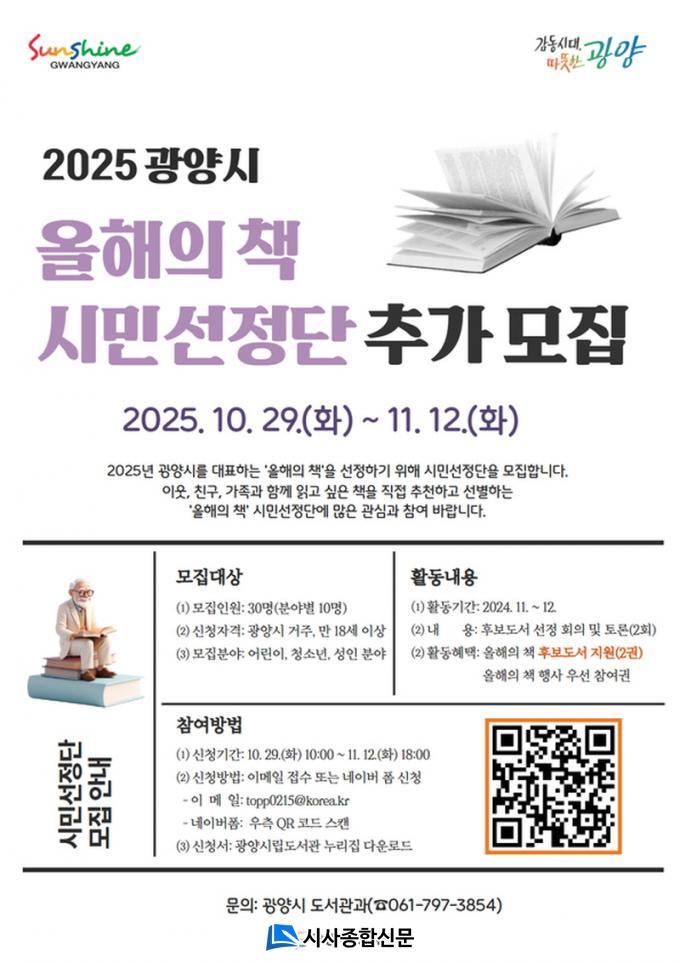 ¡®¿ÃÇØÀÇ Ã¥¡¯ ½Ã¹Î¼±Á¤´ÜÀº Ã¥ Àб⿡ °ü½É ÀÖ´Â ¸¸ 18¼¼ ÀÌ»óÀÇ ±¤¾ç½Ã¹Î ´©±¸³ª Âü¿©ÇÒ ¼ö ÀÖ´Ù. Âü¿©¸¦ ¿øÇÏ´Â ½Ã¹ÎÀº ±¤¾ç½Ã¸³µµ¼°ü ´©¸®Áý¿¡¼ ½Åû¼¸¦ ³»·Á¹Þ¾Æ ´ã´çÀÚ À̸ÞÀÏ·Î Á¢¼öÇϰųª È«º¸¹® ³» QRÄÚµå ½ºÄµÀ» ÅëÇÑ ¿Â¶óÀÎ ÀÀ´äÀ»(³×À̹ö Æû) ÅëÇØ Âü¿© ½ÅûÇÒ ¼ö ÀÖ´Ù.
