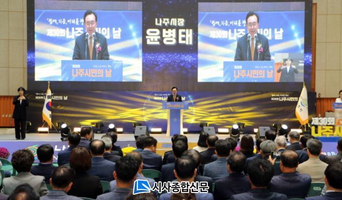 À±º´Å ³ªÁÖ½ÃÀåÀº ±â³ä»ç¿¡¼ ¡°»õ·Î¿î ¿µ»ê° ¸£³×»ó½º ½Ã´ë ºñÀüÀ» ´ã¾Æ 2õ³â ¿ª»ç¹®ÈÀ¯»ê°ú õÇý »ýÅÂÀÚ¿øÀ» ǰÀº ¿µ»ê°À» ±â¹ÝÀ¸·Î 500¸¸ °ü±¤½Ã´ë¸¦ ÀÌ·ï°¡°Ú´Ù¡±°í ¸»Çß´Ù. ÀÌ¾î ¡°¹Ì·¡ ¿¡³ÊÁö½Å»ê¾÷À» Áß½ÉÀ¸·Î¡¤Åº¼ÒÁ߸³ ¼±µµµµ½Ã·Î °Åµì³ª°í ³ªÁֱ۷ιú ¿¡³ÊÁöÆ÷·³À» ³ªÁÖ°¡ ¸¸µé¾î°¥ ¿¡³ÊÁö»ê¾÷ ¹Ì·¡¿Í À§»óÀ» Á¦½ÃÇÏ´Â ¼¼°èÀûÀÎ Æ÷·³À¸·Î Á¤¸³Çذ¡°Ú´Ù¡±°í µ¡ºÙ¿´´Ù.