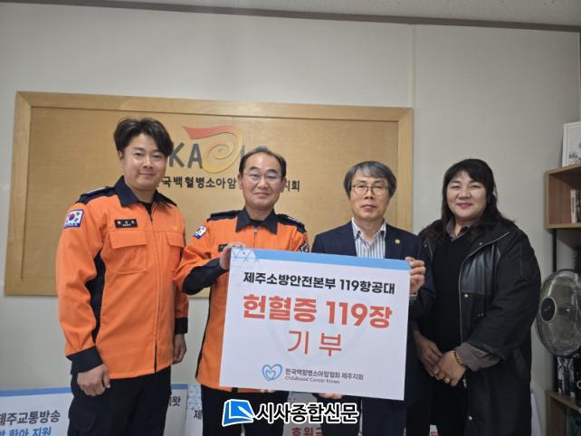 À̹ø Çà»ç´Â 119Ç×°ø´ë¿øµéÀÇ ¶æÀ¸·Î ½ÃÀÛµÆÀ¸¸ç, ´Üü ÇåÇ÷À» ÅëÇØ ¸ðÀº ÃÑ 119ÀåÀÇ ÇåÇ÷ÁõÀº (»ç)Çѱ¹¹éÇ÷º´¼Ò¾Æ¾ÏÇùȸ Á¦ÁÖµµÁöȸ¿¡ ±âºÎµÆ´Ù. À̸¦ ÅëÇØ ¼ÒÁßÇÑ »ý¸íÀ» »ì¸®°í »ý¸í ³ª´®ÀÇ °¡Ä¡¸¦ È®»êÇÏ·Á´Â ´ë¿øµéÀÇ µû¶æÇÑ ¸¶À½ÀÌ ÀüÇØÁ³´Ù. ƯÈ÷, Áö³ 9ÀÏ Çùȸ ¼Ò¼Ó ¼Ò¾Æ¾Ï ȯ¿ì¿Í °¡Á· 25¸íÀ» 119Ç×°ø´ë·Î ÃÊûÇÏ¿© Ưº°ÇÑ ½Ã°£À» ¼±¹°Çß´Ù.