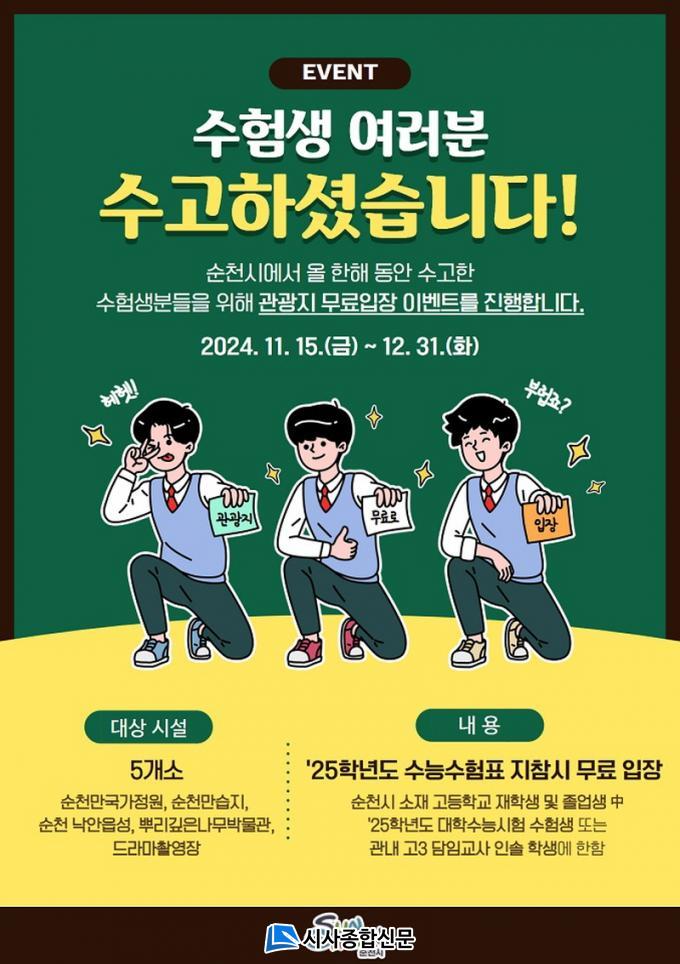 ¹«·á·Î °³¹æµÇ´Â °ü±¤Áö´Â ¼øÃµ¸¸±¹°¡Á¤¿ø, ¼øÃµ¸¸½ÀÁö, ¼øÃµ ³«¾ÈÀ¾¼º, »Ñ¸®±íÀº³ª¹«¹Ú¹°°ü, µå¶ó¸¶ÃÔ¿µÀåÀ¸·Î ¼øÃµÀ» ´ëÇ¥ÇÏ´Â 5°³ ¸í¼Ò´Ù. ÀÌµé °ü±¤Áö´Â ´Ù¾çÇÑ ÀÚ¿¬°ú ¹®ÈÀû Ư»öÀ» Áö´Ñ Àå¼Ò·Î, ¼öÇè»ýµéÀÌ Àϻ󿡼 ¹þ¾î³ª »õ·Î¿î °æÇèÀ» ½×À» ¼ö ÀÖ´Â ±âȸ¸¦ Á¦°øÇÑ´Ù.