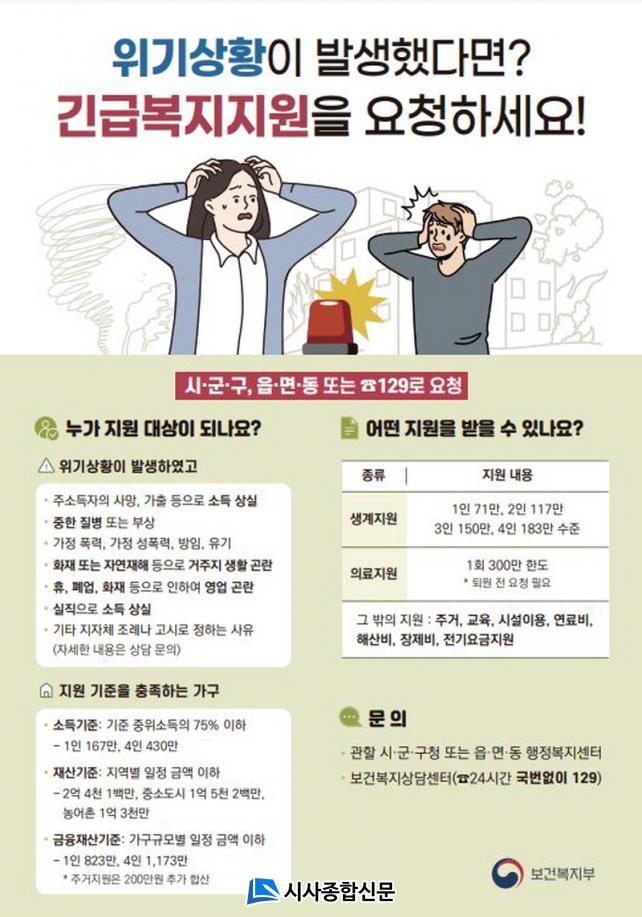 ±ä±Þº¹Áö Áö¿øÀ» ½ÅûÇÏ·Á¸é À¾¡¤¸é¡¤µ¿ Áֹμ¾ÅÍ, ½Ãû »çȸº¹Áö°ú, º¸°Çº¹Áö»ó´ã¼¾ÅÍ(¢Ï129), Èñ¸Áº¹ÁöÁö¿ø´Ü Äݼ¾ÅÍ(¢Ï538-0129)¸¦ ÅëÇØ »ó´ã¹ÞÀ» ¼ö ÀÖ´Ù. Áö¿øÀº »ó´ã°ú ÇöÀå È®ÀÎ ÈÄ ¼Òµæ ¹× Àç»ê ±âÁØÀ» ÃæÁ·ÇÏ´Â ´ë»óÀÚ¿¡°Ô Á¦°øµÈ´Ù. 1ÀÎ °¡±¸ ±âÁØ »ý°èºñ´Â 71¸¸¿øÀ̸ç, ÀÇ·áºñ´Â ÃÖ´ë 300¸¸¿ø±îÁö Áö¿øµÈ´Ù.
