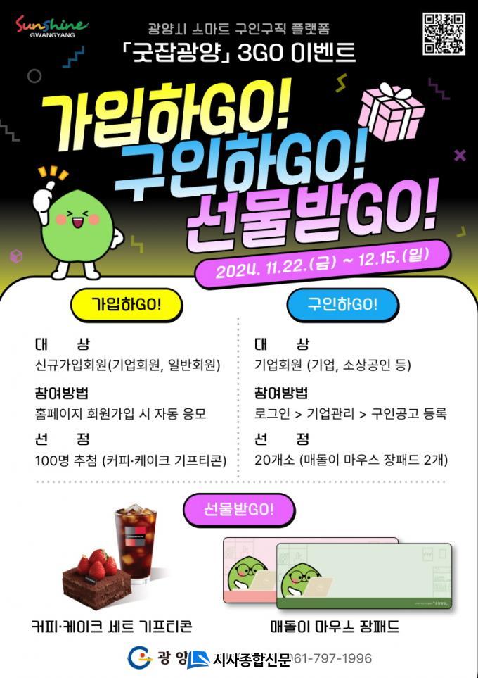 ±â¾÷ȸ¿ø(»ç¾÷ÀÚ)À» ´ë»óÀ¸·Î ÇÑ À̺¥Æ®´Â ¡®±¸Àΰø°í µî·Ï¡¯ À̺¥Æ®´Ù. ±¸ÀÎ ¼ö¿ä°¡ ÀÖ´Â ±â¾÷ÀÌ Ç÷§Æû ȨÆäÀÌÁö(https://job.gwangyang.go.kr)¿¡ ä¿ë°ø°í¸¦ µî·ÏÇϸé À̺¥Æ®¿¡ ÀÚµ¿ Âü¿©ÇÏ°Ô µÇ´Â ¹æ½ÄÀÌ´Ù. ±¤¾ç½Ã´Â 20°³¼Ò¸¦ ÃßÃ·ÇØ ±¤¾ç½Ã ¸¶½ºÄÚÆ®°¡ ±×·ÁÁø ¸Åµ¹ÀÌ ¸¶¿ì½ºÀåÆÐµå¸¦ 2°³¾¿ ÁõÁ¤ÇÒ °èȹÀÌ´Ù.