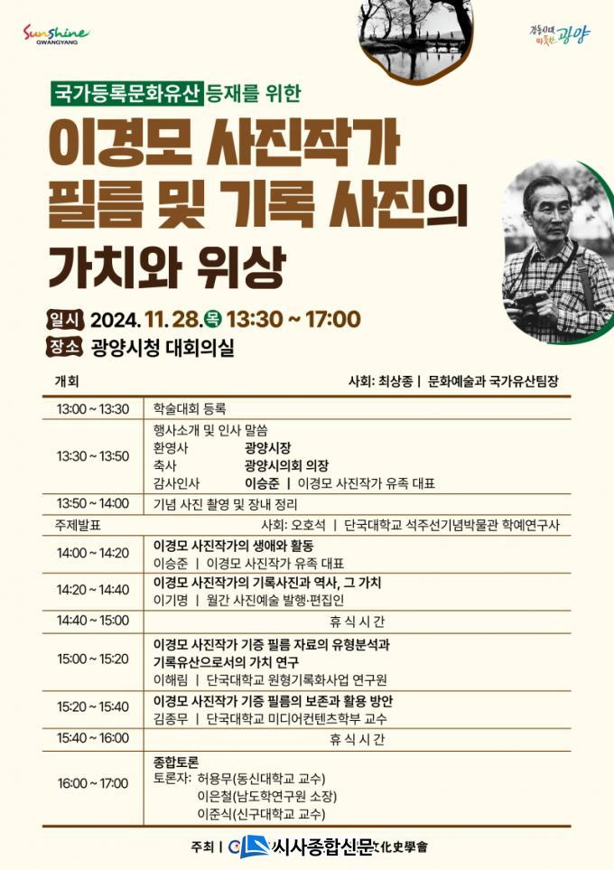 Çмú´ëȸ´Â ÁÖÁ¦¹ßÇ¥¿Í Á¾ÇÕÅä·ÐÀ¸·Î ÁøÇàµÉ ¿¹Á¤ÀÌ´Ù. ¹ßÇ¥´Â ¡ãÀ̰æ¸ð »çÁøÀÛ°¡ÀÇ »ý¾Ö¿Í Ȱµ¿(À̽ÂÁØ, À̰æ¸ð »çÁøÀÛ°¡ À¯Á· ´ëÇ¥) ¡ãÀ̰æ¸ð »çÁøÀÛ°¡ÀÇ ±â·Ï»çÁø°ú ¿ª»ç, ±× °¡Ä¡(À̱â¸í, ¿ù°£ »çÁø¿¹¼ú ¹ßÇࡤÆíÁýÀÎ) ¡ãÀ̰æ¸ð »çÁøÀÛ°¡ ±âÁõ Çʸ§ ÀÚ·áÀÇ À¯ÇüºÐ¼®°ú ±â·ÏÀ¯»êÀ¸·Î¼ÀÇ °¡Ä¡ ¿¬±¸(ÀÌÇØ¸², ´Ü±¹´ëÇб³ ¿øÇü±â·ÏÈ»ç¾÷ ¿¬±¸¿ø) ¡ãÀ̰æ¸ð »çÁøÀÛ°¡ ±âÁõ Çʸ§ÀÇ º¸Á¸°ú Ȱ¿ë ¹æ¾È(±èÁ¾¹«, ´Ü±¹´ëÇб³ ¹Ìµð¾îÄÁÅÙÃ÷ÇкΠ±³¼ö)¡±±îÁö ÃÑ 4°³ ÁÖÁ¦·Î ±¸¼ºµÆ´Ù.