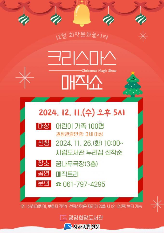 ±¤¾çÈñ¸Áµµ¼°üÀº ¸Å´Þ Áö¿ª ¾î¸°À̵éÀ» ´ë»óÀ¸·Î ¹®È ¿¹¼ú°ø¿¬À» Á¦°øÇÏ´Â Æ¯È ÇÁ·Î±×·¥ ¡®Èñ¸Á¹®È³îÀÌÅÍ¡¯¸¦ ¿î¿µ ÁßÀÌ´Ù. À̹ø 12¿ù °ø¿¬Àº Å©¸®½º¸¶½º¸¦ ¸Â¾Æ ¿Â °¡Á·ÀÌ ÇÔ²² Áñ±æ ¼ö ÀÖ´Â Å©¸®½º¸¶½º Ưº° ¸¶¼ú °ø¿¬À¸·Î ±âȹÇß´Ù.