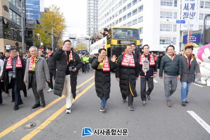 ¼±¼ö´ÜÀº »ç¸éÀÌ °³¹æµÈ 2Ãþ ¹ö½º¿¡ ¿Ã¶ó ½Ã¹Îµé¿¡°Ô °¨»ç Àλ縦 ÀüÇß´Ù. °±âÁ¤ ½ÃÀå°ú ½Ã¹ÎµéÀº ÆÛ·¹À̵å Â÷·® ÁÖº¯¿¡¼ µµº¸ ÇàÁøÇϸç ÃàÇÏÇß´Ù.