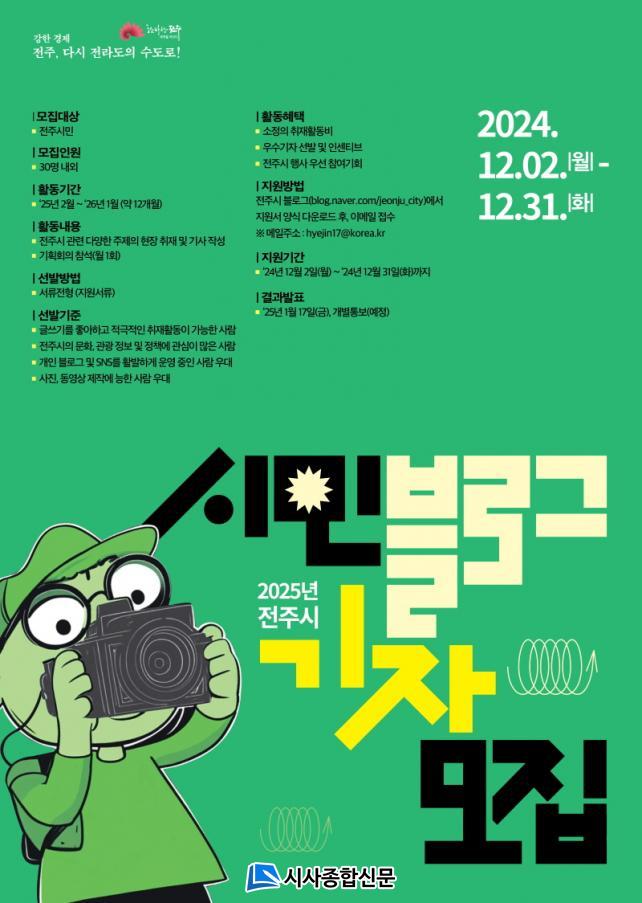 Áö³ 2012³âºÎÅÍ ¿î¿µµÈ ½Ã¹Î ºí·Î±× ±âÀÚ´ÜÀº ´Ù¾çÇÑ °èÃþ°ú ¿¬·É´ë·Î ±¸¼ºµÅ ÀÏ¹Ý ½Ã¹ÎÀÇ ÀÔÀå¿¡¼ Áø¼ÖÇÏ°í »ý»ýÇÑ ÀüÁÖÀÇ À̾߱⸦ Àü´ÞÇØ¿Ô´Ù. ÃÑ30¸í ³»¿Ü·Î ¼±¹ßÇÒ ¿¹Á¤ÀÎ 2025³â ½Ã¹Î ºí·Î±× ±âÀÚ´ÜÀº ÀüÁÖ¿¡ °ÅÁÖÇÏ´Â »ç¶÷ÀÌ¸é ´©±¸³ª Áö¿øÇÒ ¼ö ÀÖÀ¸¸ç, ÇÕ°ÝÀÚ´Â ³»³â 1¿ù 17ÀÏ ¹ßÇ¥µÉ ¿¹Á¤ÀÌ´Ù.