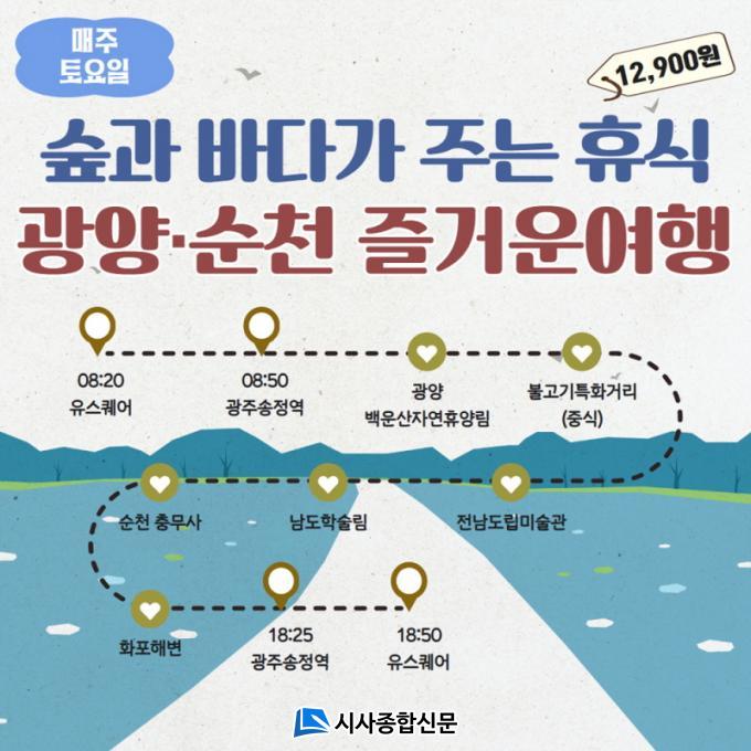 ¸ÅÁÖ Åä¿äÀÏ ±¤ÁÖ À¯½ºÄù¾î¿¡¼ Ãâ¹ßÇÏ´Â ¡®±¤¾ç-¼øÃµ Áñ°Å¿î ¿©Ç࡯Àº ±¤¾çÀÇ ½£°ú ¼øÃµÀÇ ¹Ù´Ù¸¦ µÎ·ç Áñ±æ ¼ö ÀÖ´Â Èú¸µ ÄÚ½º·Î °íÁî³ËÇÑ °Ü¿ïÀÇ ³¶¸¸À» ¼±»çÇÑ´Ù. ƯÈ÷, ÇÑ°Ü¿ï ¹é¿î»êÀÚ¿¬È޾縲ÀÇ Ã»·®ÇÔÀ» ¸¸³£ÇÏ°í ±¤¾çºÒ°í±âƯȰŸ®¿¡¼ ÃëÇâ¿¡ µû¶ó Áñ±â´Â Á¡½ÉÀº ¿©ÇàÀÇ ±Ã±ØÀûÀÎ ¸ñÀûÀ» Àϱú¿ö ÁØ´Ù.