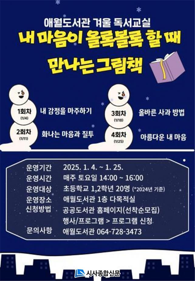 °Ü¿ïµ¶¼±³½Ç Âü¿©¸¦ Èñ¸ÁÇÏ´Â ¾î¸°À̵éÀº 12¿ù 16ÀϺÎÅÍ Á¦ÁÖÆ¯º°ÀÚÄ¡µµ °ø°øµµ¼°ü(https://www.jeju.go.kr/lib) ¢Ñ Çà»ç/ÇÁ·Î±×·¥ ¢Ñ µµ¼°ü ÇÁ·Î±×·¥ ½ÅûÀ» ÅëÇØ Á¢¼öÇÏ¸é µÈ´Ù.